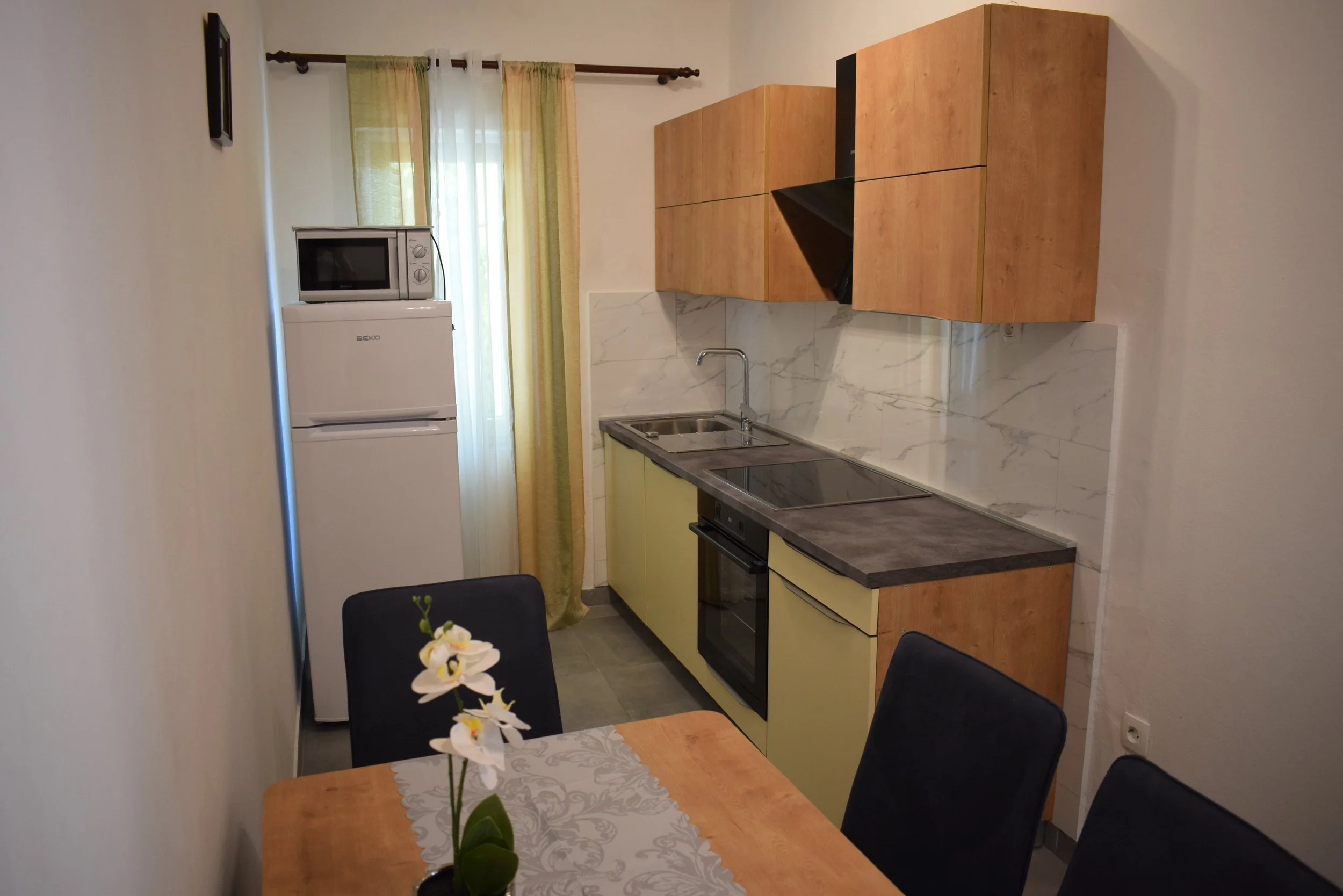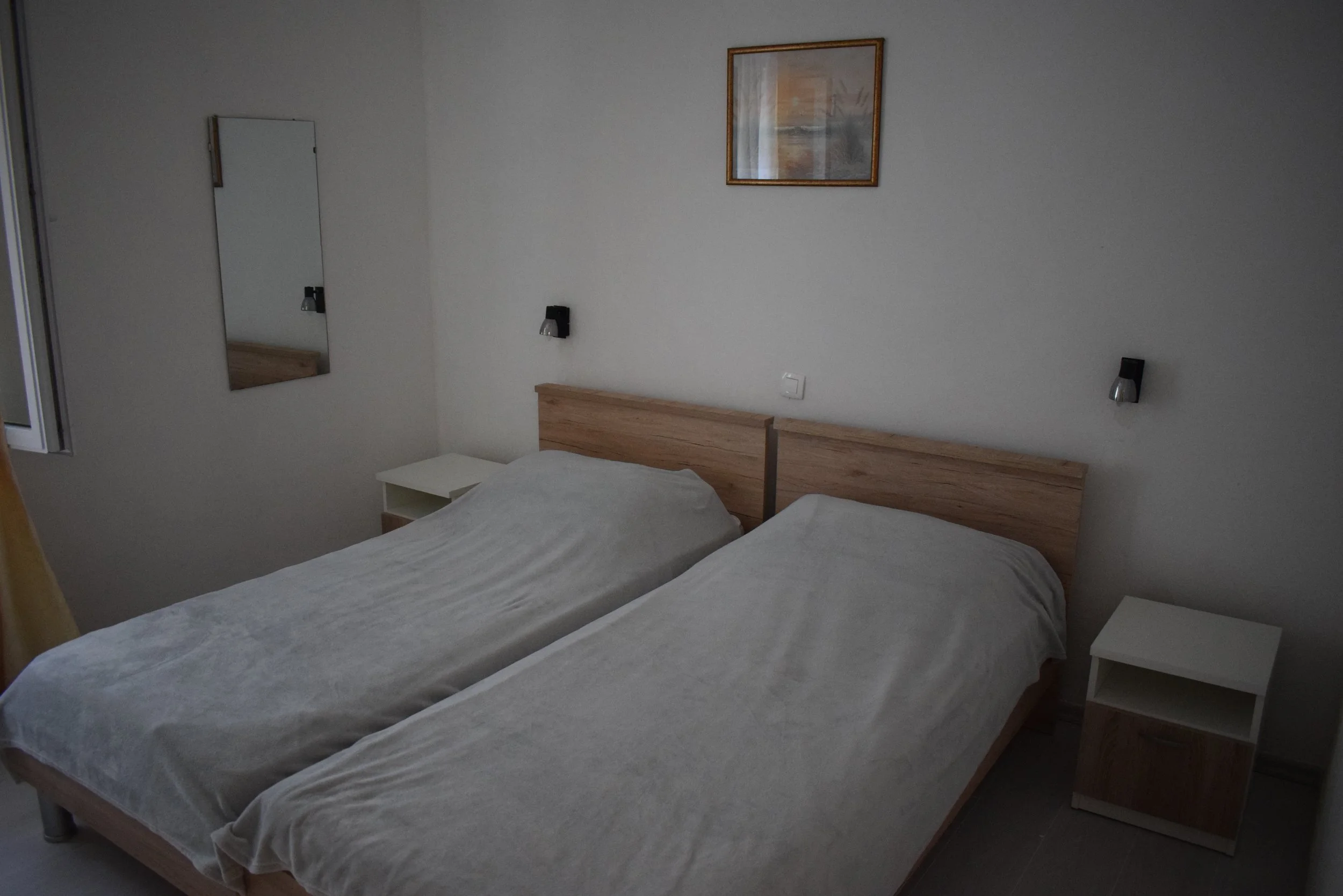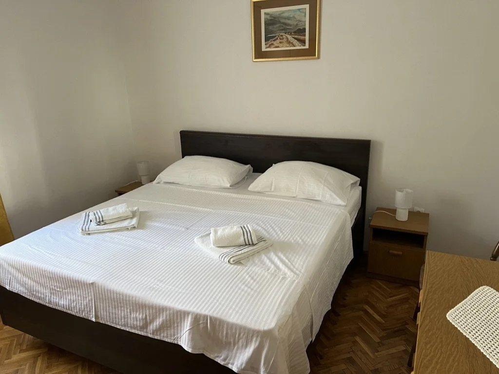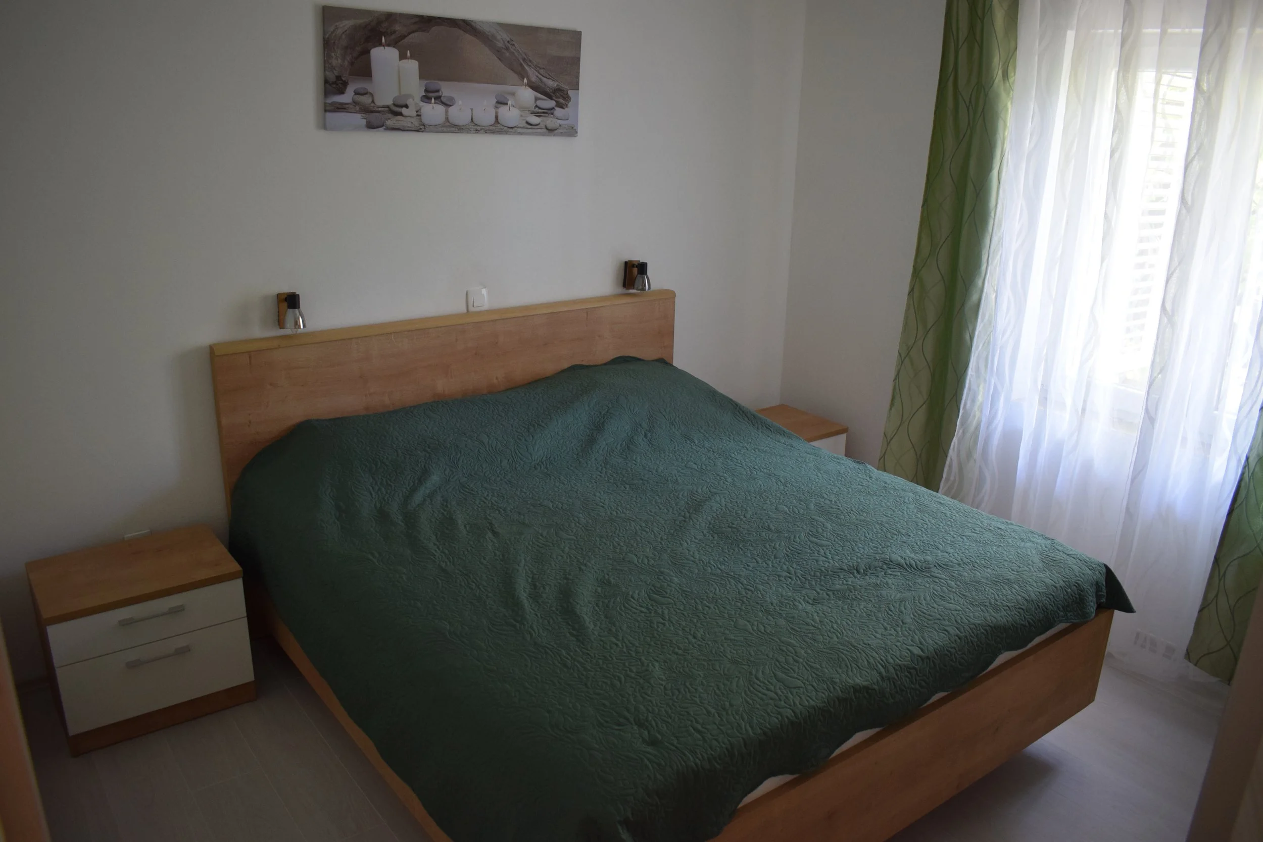 Apartment is on the first with partial sea/city view. There is queen bed (180x200cm) in bedroom and two single beds (90x200cm) in other bedroom with balcony access. Kitchen is equipped with stove, microwave and fridge. Offer includes parking spot.