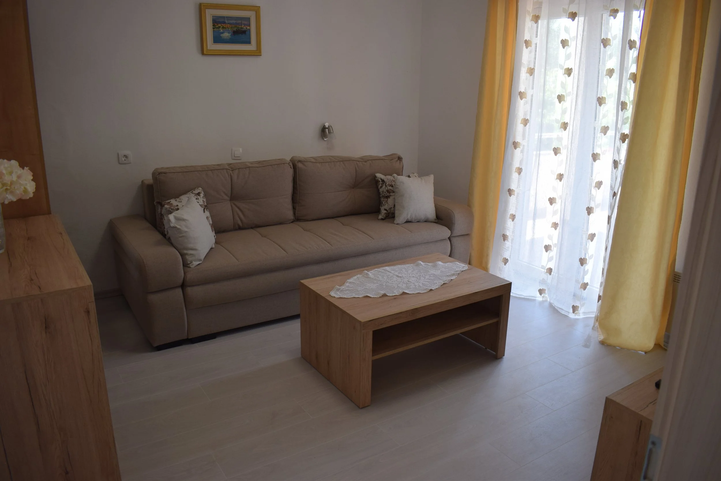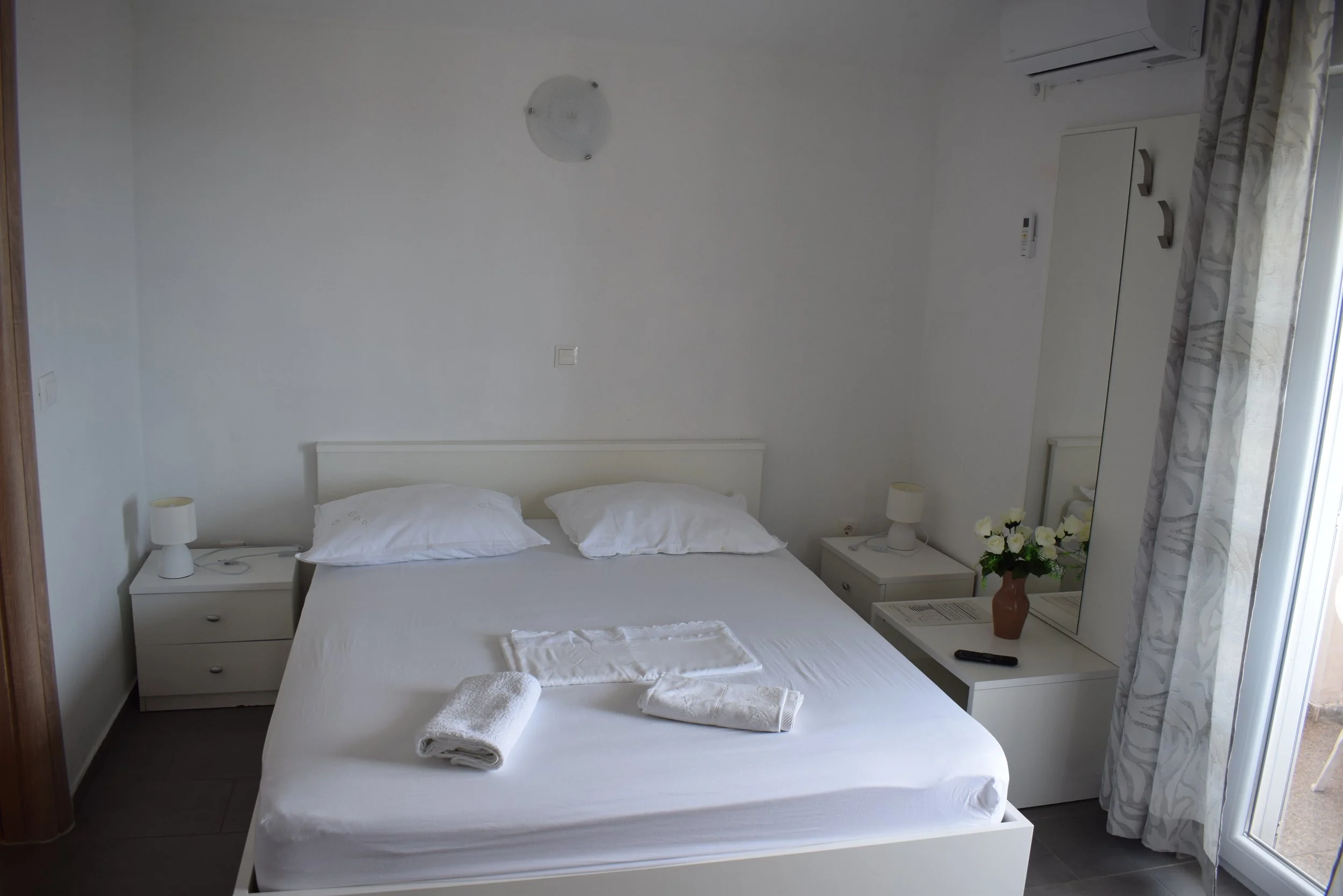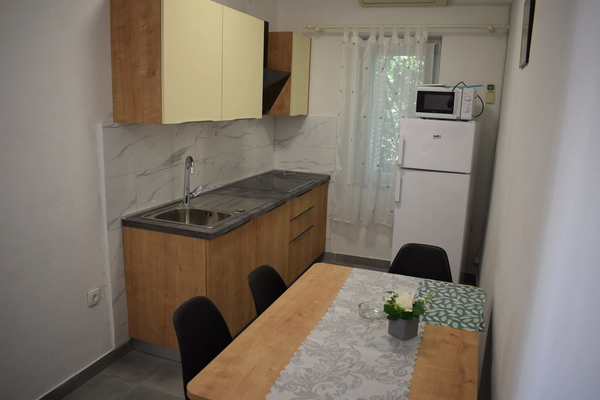 Apartment is on the first with partial sea/city view. There is queen bed (180x200cm) in bedroom and two single beds (90x200cm) in other bedroom with balcony access. Kitchen is equipped with stove, microwave and fridge. Offer includes parking spot.