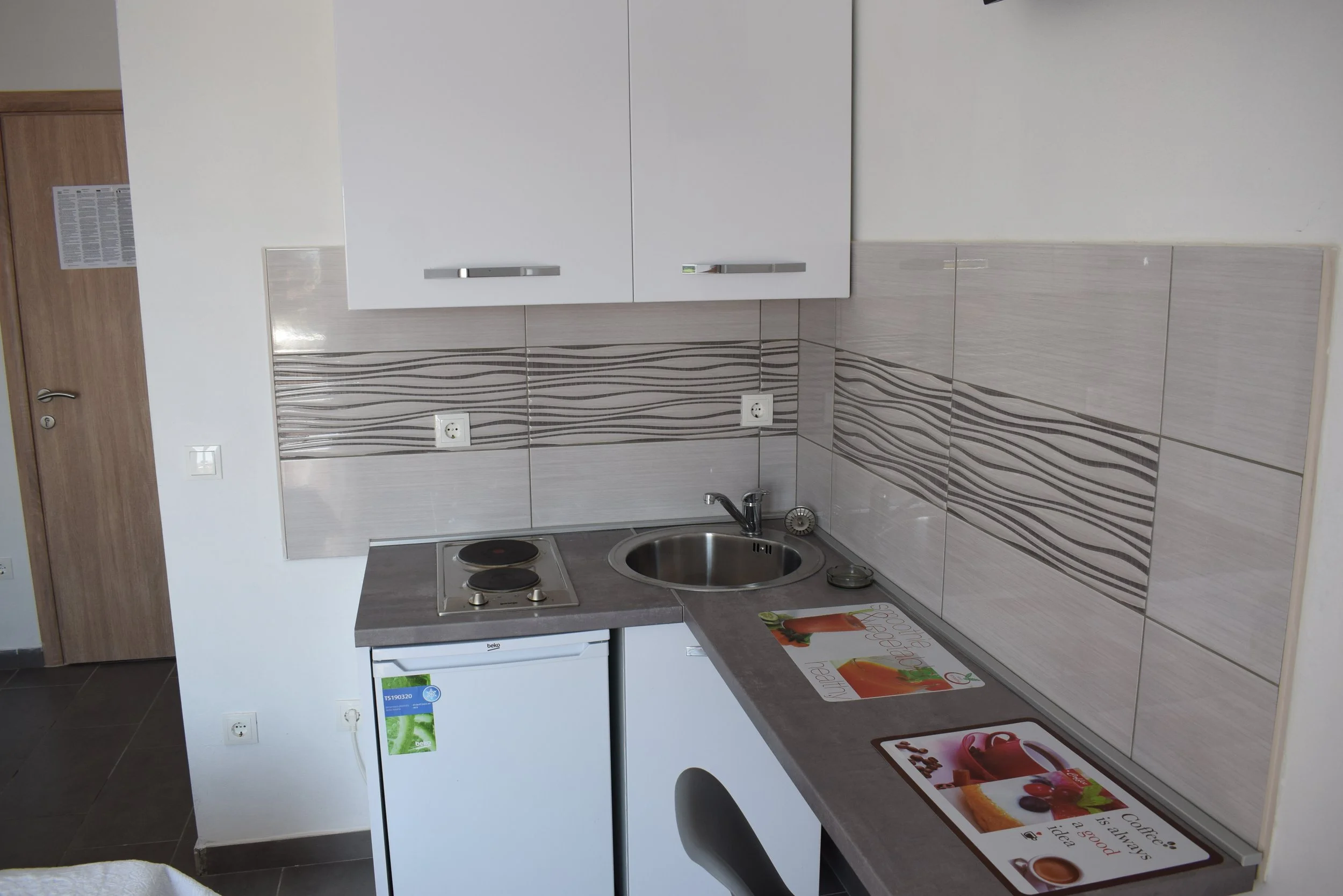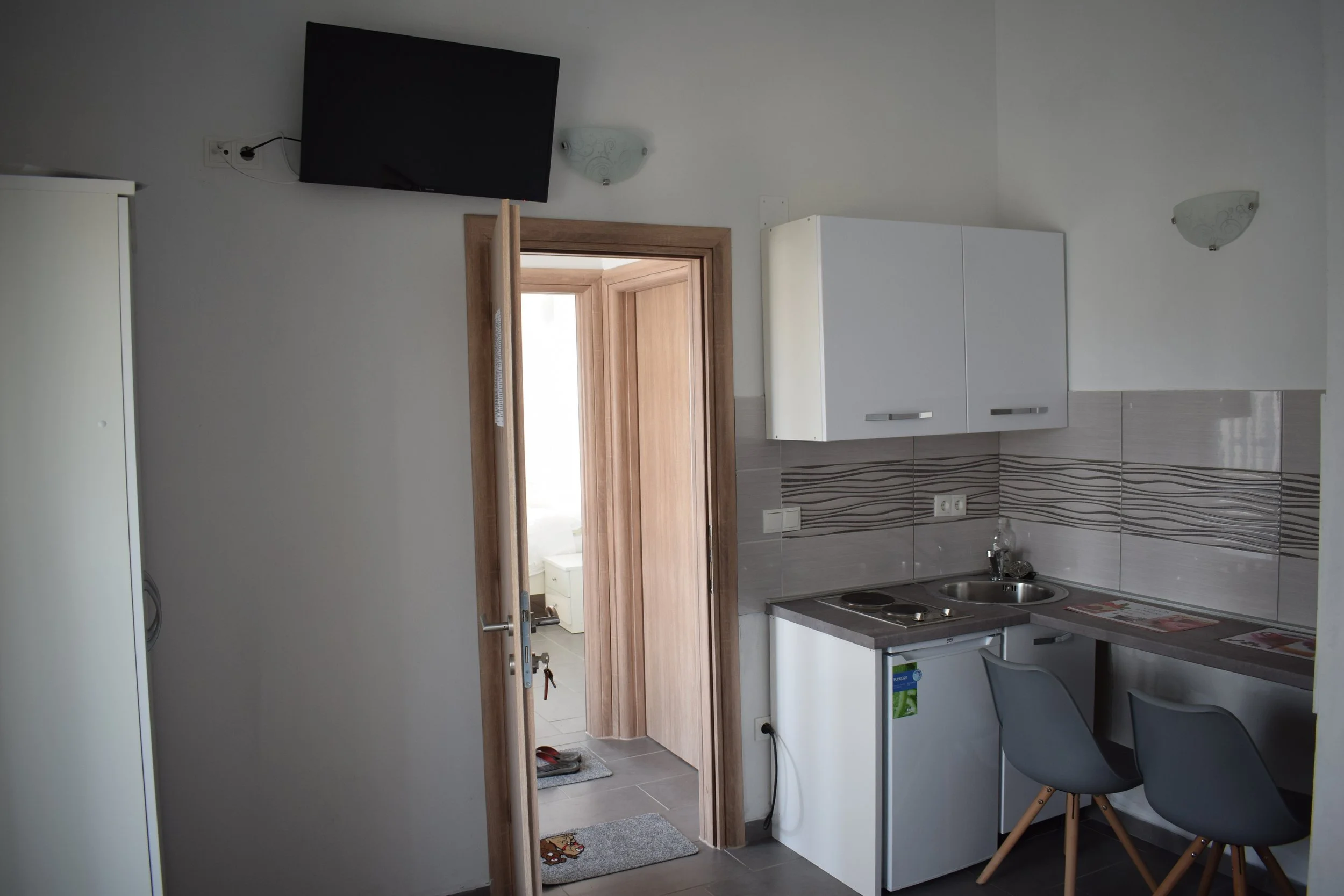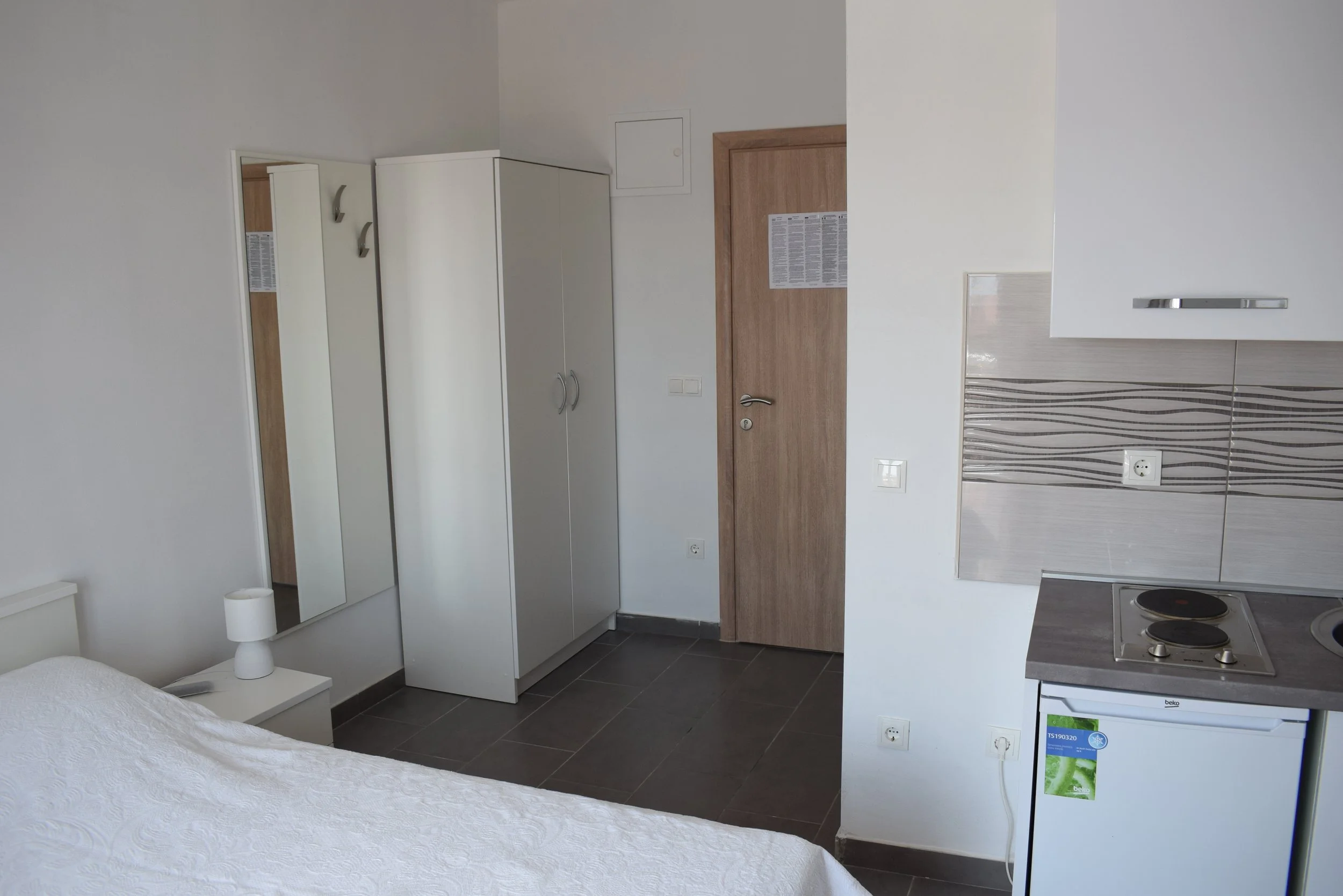 Studio is on the second floor with balcony and partial sea/city view. There is a little kitchenette equipped with stove and a fridge. Offer includes parking spot