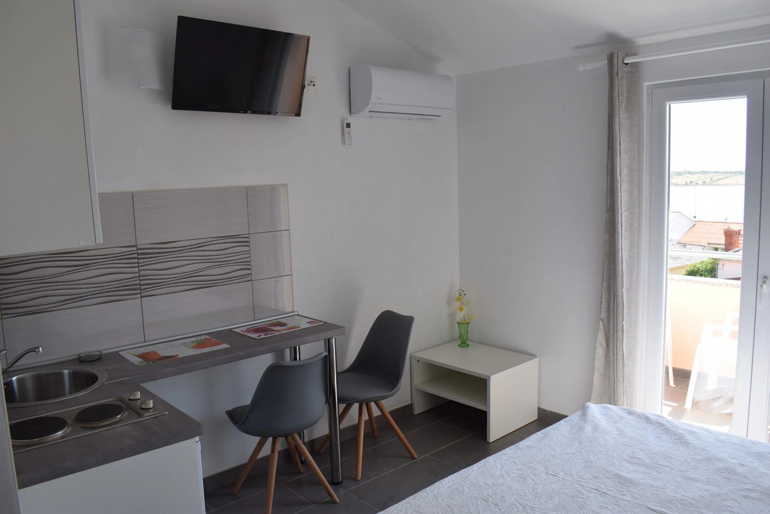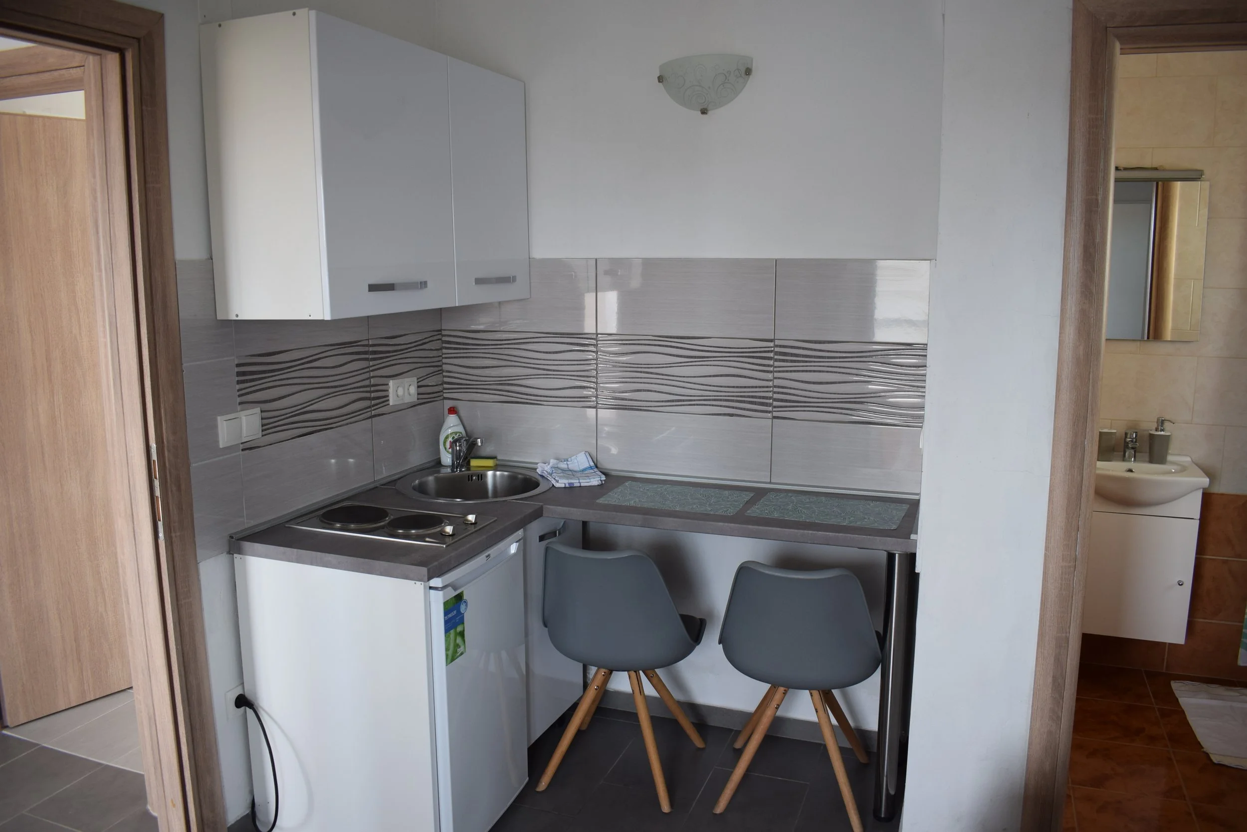 Studio is on the second floor with balcony and beautiful sea/city view. There is a little kitchenette equipped with stove and a fridge. Offer includes parking spot